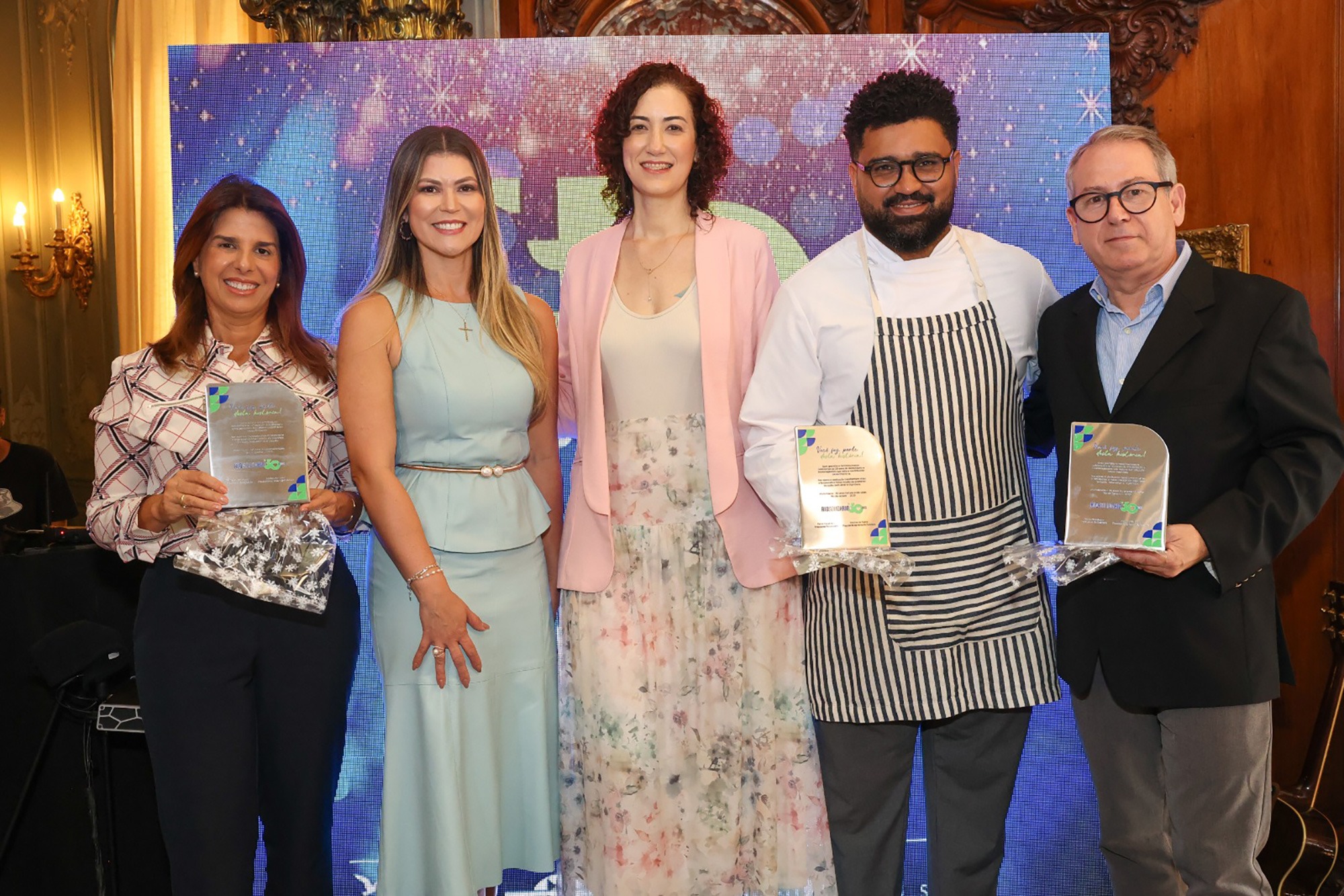 Fernanda Amaral, o Chef Danilo Parah e Gustavo Gil com a Presidente de Honra e Primeira-Dama do Estado, Analine Castro, e a Presidente do RIoSolidario, Paola Figueiredo.